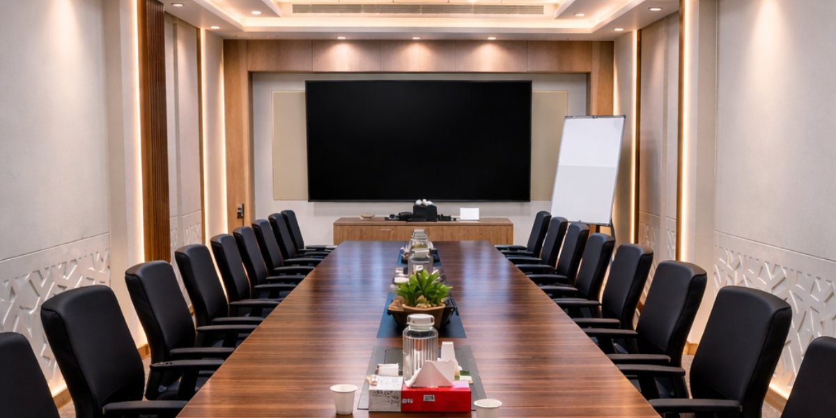 The large boardroom required advanced microphone coverage, enterprise‑level VC stability, and support for multiple presentation formats (HDMI, USB‑C, wireless) – all while maintaining clean corporate aesthetics and ensuring echo‑free hybrid meetings. The client specifically requested a large professional display, high‑quality 4K video conferencing, crystal‑clear voice pickup across the entire table, uniform room sound, wireless presentation, multiple wired inputs, and simple one‑touch operation for non‑technical users.